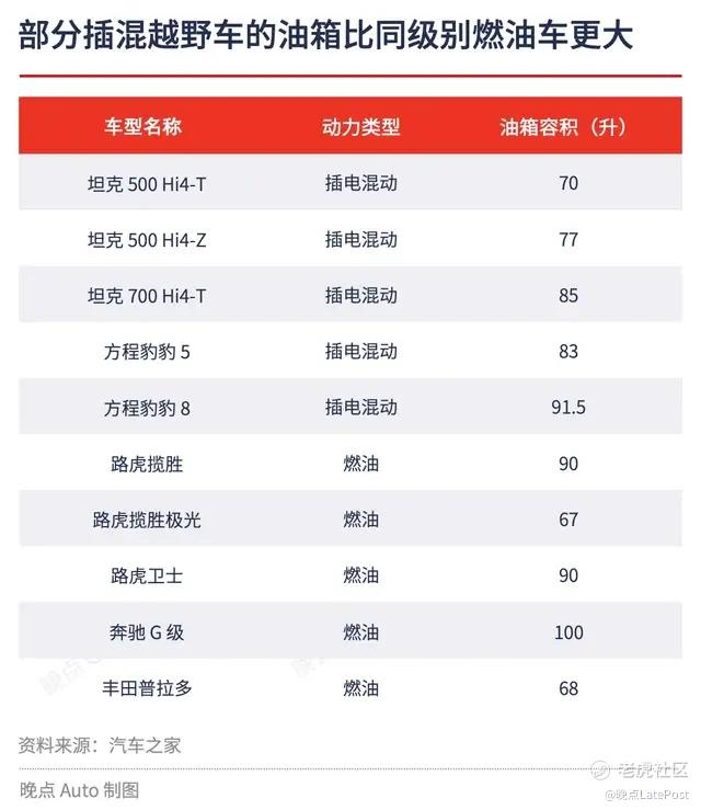燃油越野车通常是高油耗车型,像路虎以前就被戏称为 “油老虎”。然而,现在一些国产插混越野车的油箱也开始大过同级别燃油越野车。例如,坦克 700 的油箱容积是 85 升,比路虎揽胜极光多出 18 升;方程豹豹 8 的油箱容积是 91.5 升,比丰田普拉多高出 23.5 升,仅比奔驰 G 少了 8.5 升。