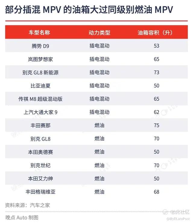 MPV 领域的情况类似。比如,别克 GL8 新能源的油箱容积是 73 升,超过别克 GL8 燃油版、别克世纪和丰田格瑞维亚;腾势 D9 的油箱比本田奥德赛、本田艾力绅多出 3 升。