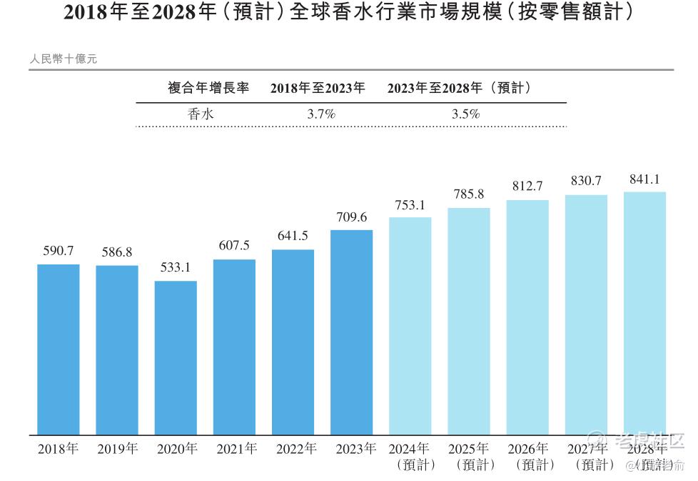 根据弗若斯特沙利文的资料,美国、巴西、法国、德国及英国为2023年香水市场规模排名前五的国家。全球香水市场规模(按零售额计)由2018年的人民币5,907亿元增加至2023年的人民币7,096亿元,复合年增长率为3.7%,预计2028年将增长至人民币8,411亿元,复合年增长率为3.5%。