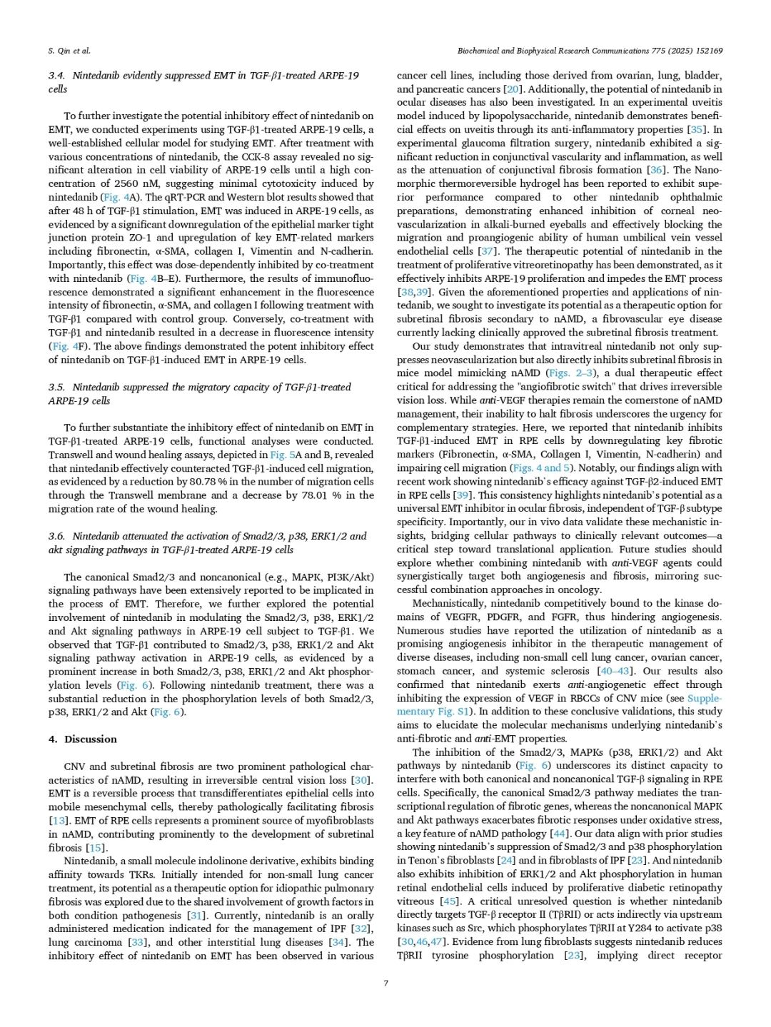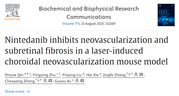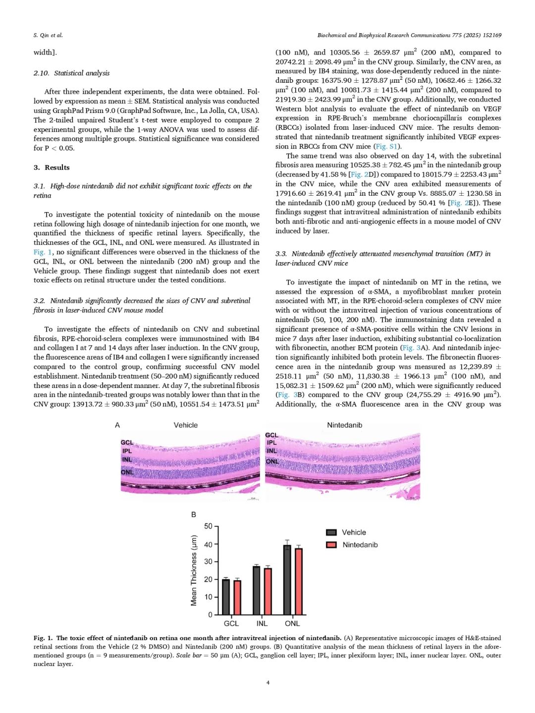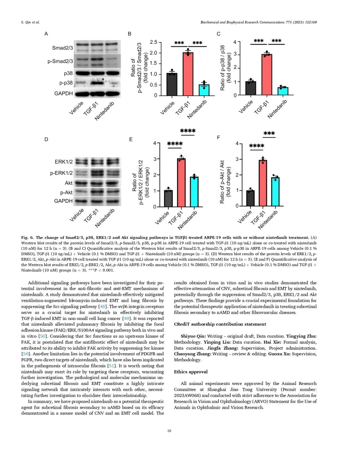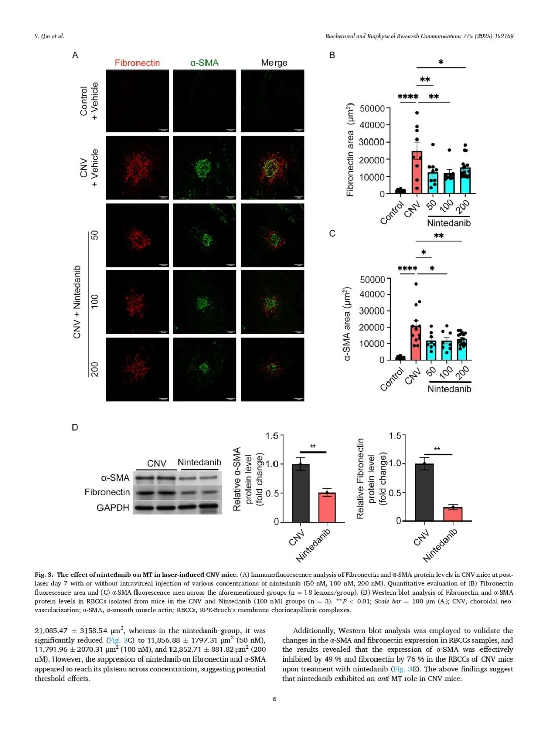 通过体外与体内的实验,研究人员发现,Nintedanib能够通过抑制SMAD2/3、P38、ERK1/2和AKT信号通路,显著减缓视网膜下纤维化及EMT的进程。这些发现为Nintedanib在治疗nAMD及其他相关纤维血管疾病中的潜在应用提供了重要的实验依据。该研究成果已发表在《Biochemical and Biophysical Research Communications》期刊上。全文如下: