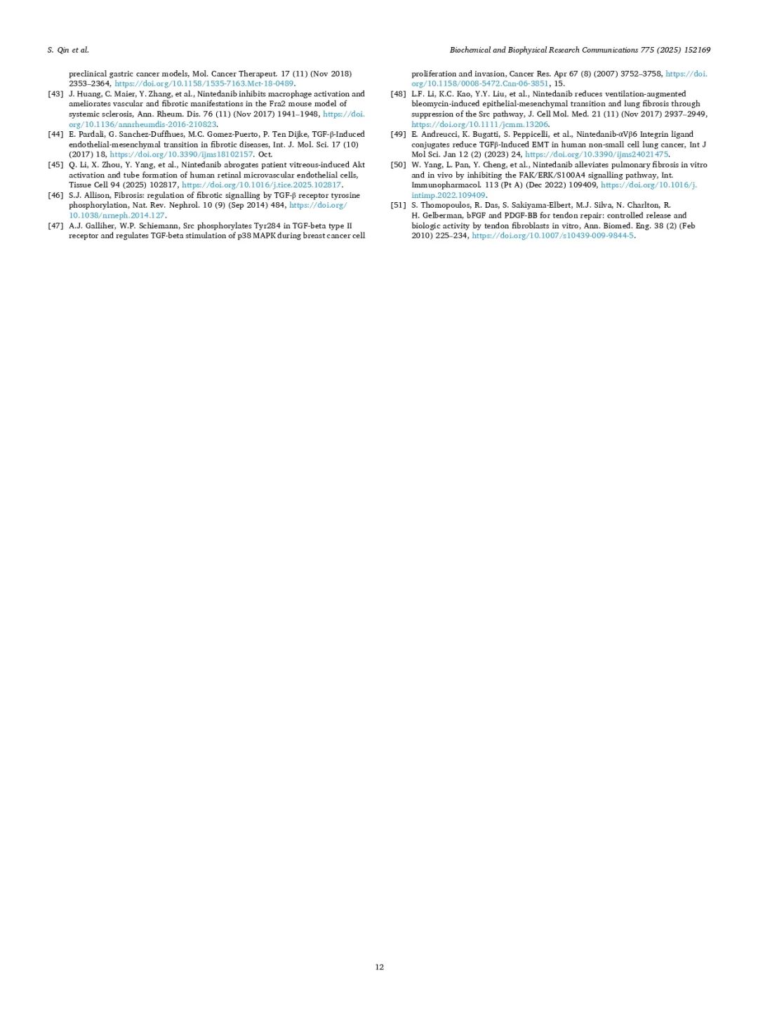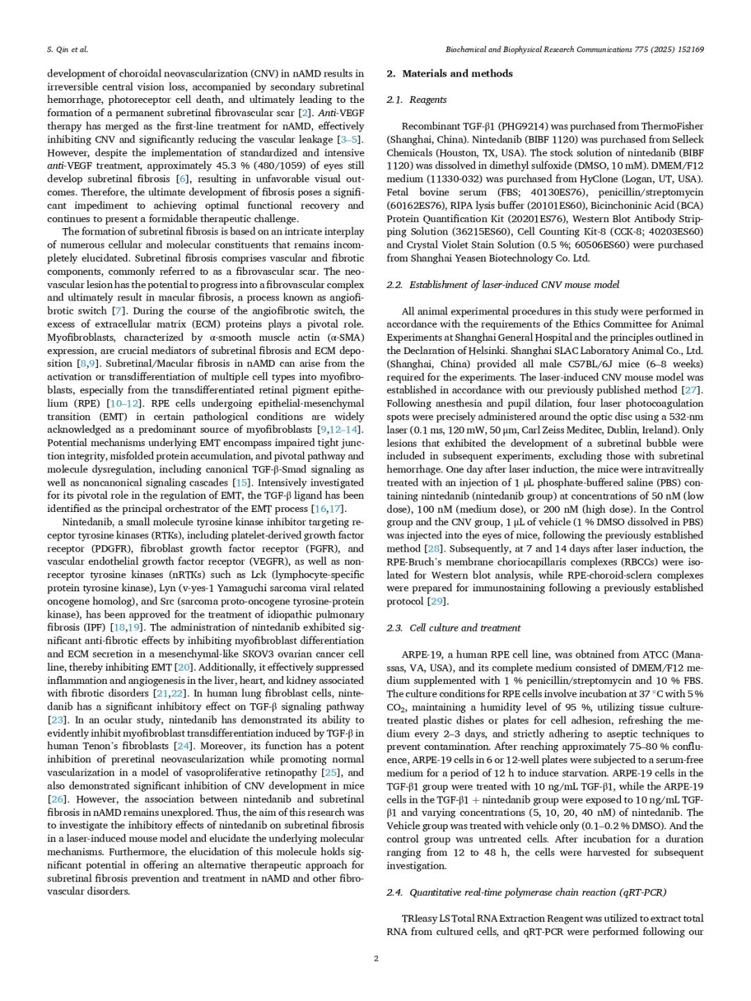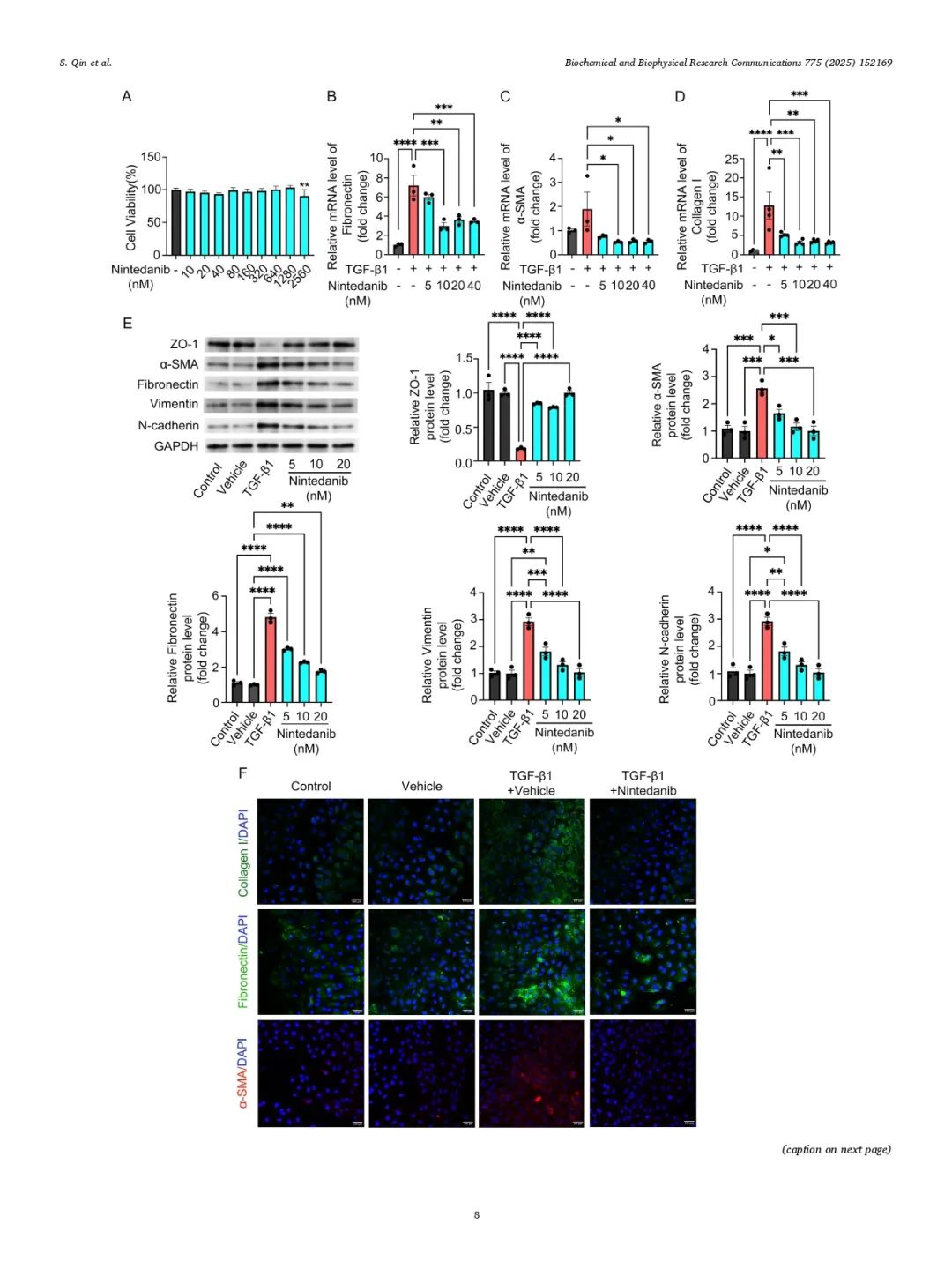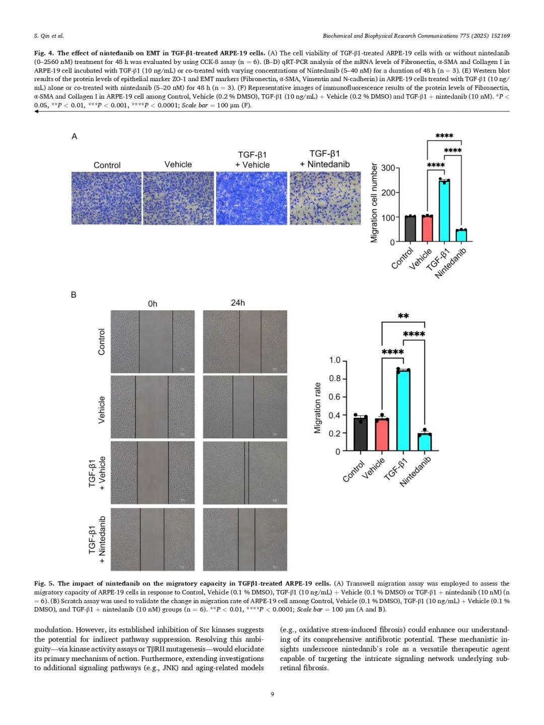 通过体外与体内的实验,研究人员发现,Nintedanib能够通过抑制SMAD2/3、P38、ERK1/2和AKT信号通路,显著减缓视网膜下纤维化及EMT的进程。这些发现为Nintedanib在治疗nAMD及其他相关纤维血管疾病中的潜在应用提供了重要的实验依据。该研究成果已发表在《Biochemical and Biophysical Research Communications》期刊上。全文如下: