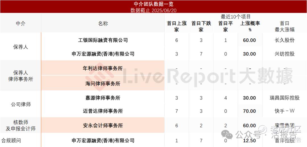 据LiveReport大数据统计,PPLabs中介团队共计8家,其中保荐人2家,近10家保荐项目数据表现不太好;公司律师共计2家,综合项目数据表现暗淡。整体而言中介团队历史数据表现不尽如意。