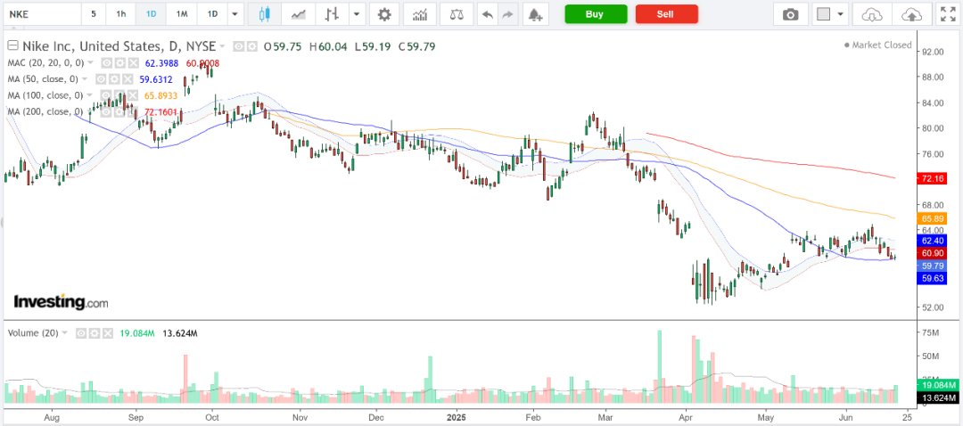 耐克股价于4月10日触及2025年低位52.28美元,上周五收报59.79美元,仅略高于50日移动平均线(59.35美元),远低于200日移动平均线(71.35美元),反映股价动力减弱。该股今年迄今累跌21%。