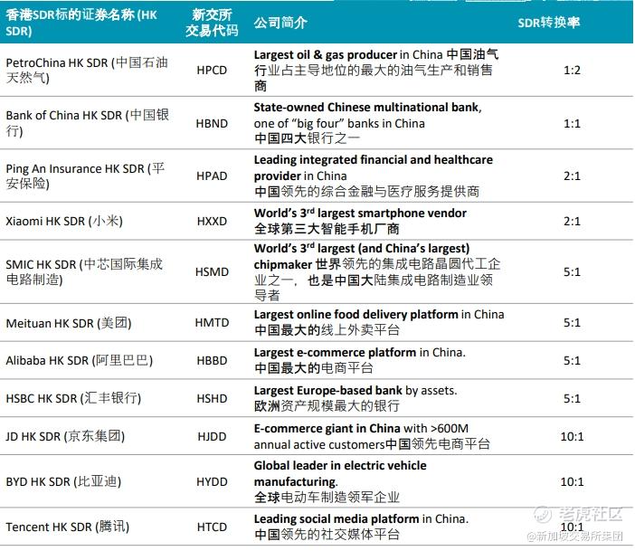 • 新加坡存托凭证是一种金融工具,标的为在海外交易所上市的证券,代表其中的实益权益。新加坡存托凭证由中介机构(即“SDR 发行人”)发行,并在新加坡证券交易有限公司 (SGX-ST) 证券市场以非保荐形式交易,SDR发行人未与标的公司签订正式协议。