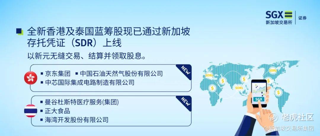 6月21日,6只全新香港及泰国蓝筹股通过新加坡存托凭证(SDR)上线。包括香港股市的京东集团、中国石油天然气股份有限公司、中芯国际集成电路制造有限公司;泰国股市的曼谷杜斯特医疗服务(集团)、正大食品、海湾开发股份有限公司。