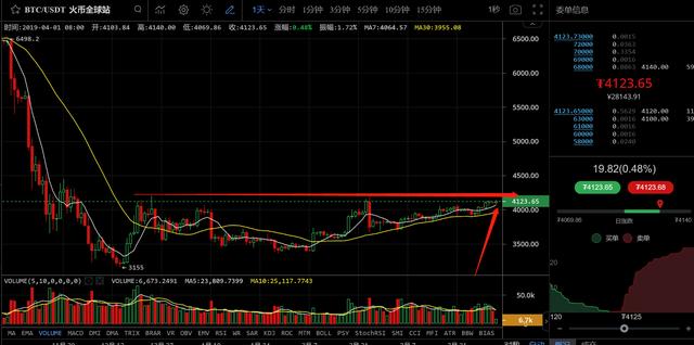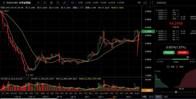 从EOS的日K线图来看,EOS在周末出现了小幅的回调,但是最终在7日均线的位置获得支撑,然后再次反弹,目前EOS的K线持续保持在7日均线之上的位置,那么问题就不大,主要是注意前高位置附近的压力,一旦形成突破,那么多单继续!如果一旦受压跌破7日均线的支撑那么就可以撤了!