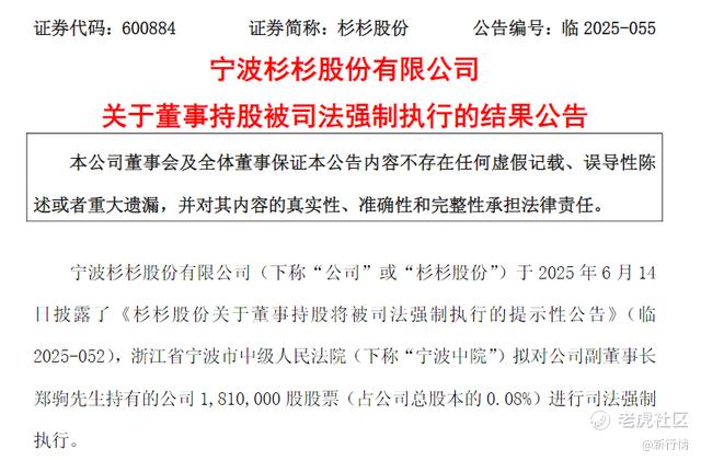 近日,杉杉股份发布公告称,浙江省宁波市中级人民法院拟对公司副董事长郑驹持有的公司181万股股票(占公司总股本的0.08%)进行司法强制执行。本次执行后,郑驹不再持有公司股份。