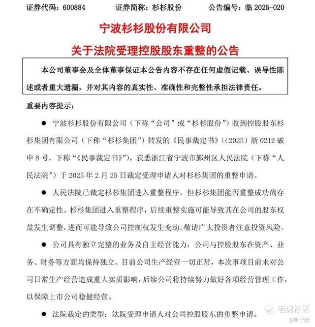 随后,2025年1月,杉杉股份控股股东及其一致行动人所持股份被冻结。与此同时,杉杉集团被申请重整。