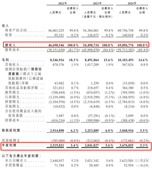 公司从2022~2024年营收分别是466.99亿、544.91亿、698.97亿,2024年营收同比增长28.27%;2022~2024年的净利润分别是25.2亿、30.42亿、36.77亿,2024年的净利润同比增长20.88%。