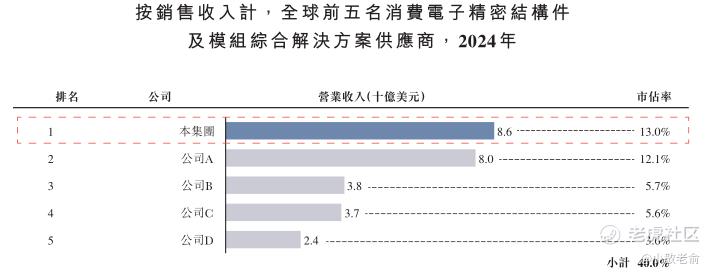 2024年,全球消费电子精密结构件及模组综合解决方案市场规模达到663亿美元。前五名参与者的合计市占率为40.0%,市场份额较为集中,其中本集团在2024年营收达86亿美元,在全球消费电子精密结构件及模组综合解决方案供应商中排名第一,市占率达13.0%。