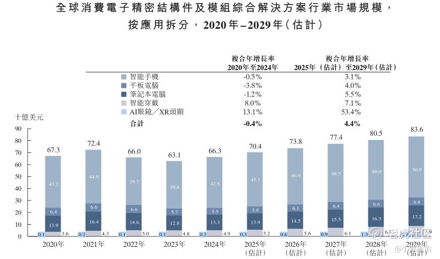 消费电子精密结构件及模组与消费电子产品的功能性、智能化和使用场景息息相关,其中智能手机是应用最大的板块,预计2029年,全球智能手机精密结构件及模组综合解决方案行业市场规模预计将达到509亿美元。此外,受AI技术持续进步以及各品牌推出的AI眼镜产品数量不断增加的推动,全球AI眼镜╱XR头显精密结构件及模组综合解决方案市场规模预计将在2029年达到17亿美元,2025年起的复合年增长率将高达53.4%。