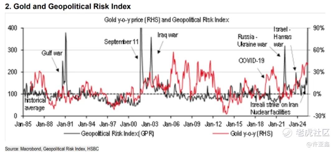 汇丰承认,黄金历来是经济和地缘政治不确定性的避险资产。学术研究证明,地缘政治风险与金价之间存在积极相关性。自9/11事件以来,特别是在过去五年,黄金价格几乎持续上涨,反映了市场对长期、未解决的不确定性的担忧。