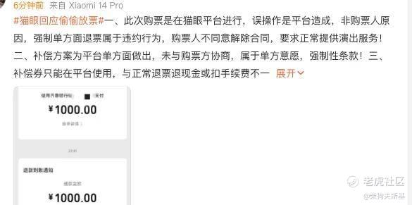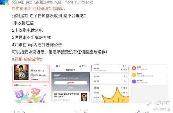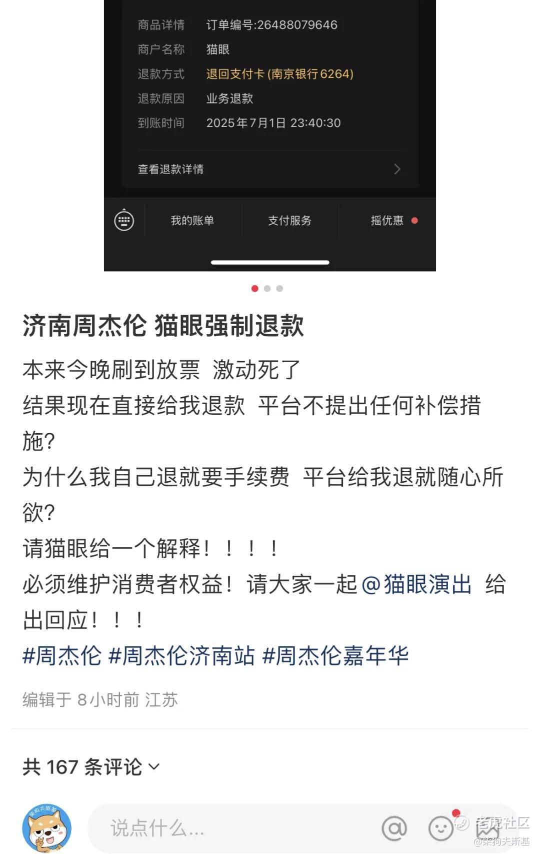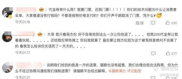 「刷到放票激动死了,结果直接退款,任何补偿措施都不提,为什么自己退,平台要收手续费,平台给用户退就这么随心所欲,请猫眼给我一个解释……」