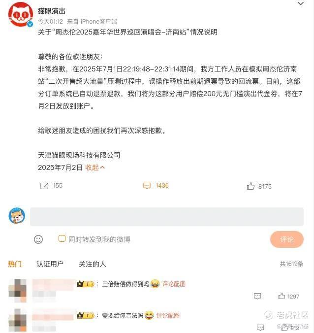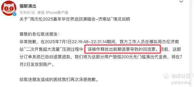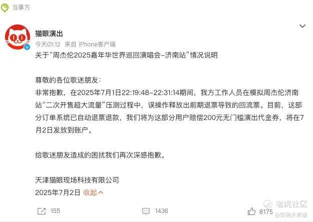 情况说明同时表示,这是工作人员在模拟周杰伦济南站「二次开售超大流量」压测,结果误操作了,所以这部分订单系统自动退票退款,给用户补偿200元无门槛演出代金券。