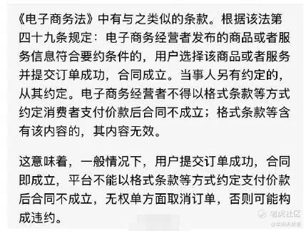 并晒出了多条相关法规,比如电子商务法中,大家已经被标错价事件洗脑到倒背如流的第四十九条规定:电子商务经营者发布的商品或者服务信息符合要约条件的,用户选择该商品或者服务并提交订单成功,合同成立……平台不能以格式条款等方式约定支付价款后合同不成立,无权单方面取消订单……