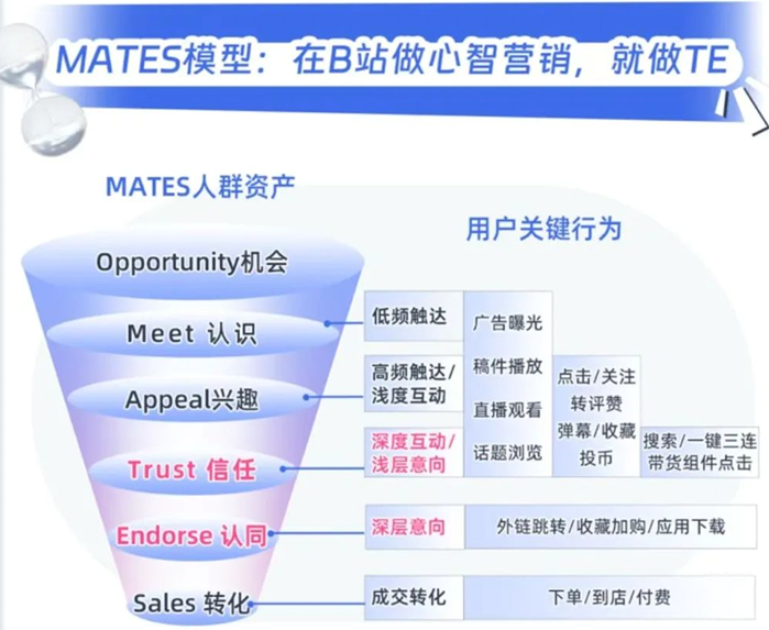 B站2024年底推出的“MATES人群资产模型”,应该是想从正面化解这个尴尬局面,尽管略带“不成熟”(为了凑一个mate单词,将信任和认同对调,不符合普通人的心智变化),但不得不说有的广告主更喜欢接受这套方法论,尤其是将其中转变点和B站内容量化指标结合,能让广告主更清晰量化投放效果。