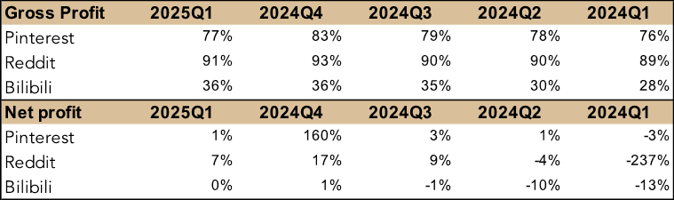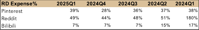 和Pinterest和Reddit相比,B站的研发费用占比只有7%左右,这固然是由于国内普遍的“降本增效”趋势的惯性使然,但也透露出管理层对技术驱动的目标感不足。