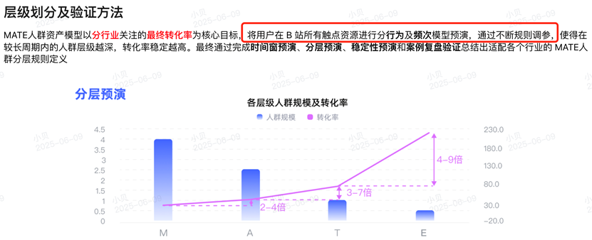 例如,B站最新推出的MATES人群资产模型产品手册中提到,“将用户在B 站所有触点资源进行分行为及频次模型预演,通过不断规则调参,使得在较长周期内的人群层级越深,转化率稳定越高”,这说明人群层级划分仍然是以行为频次的高低来划分,而不是基于真实意图或者行为理解来划分。