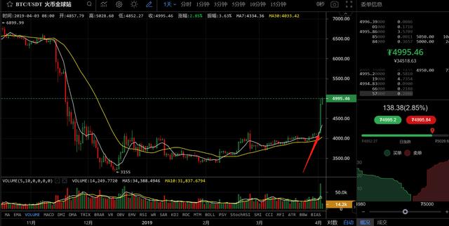 前两天的文章中,我才刚说过BTC的趋势非常强,后面会有一个加速上涨的过程,然后昨天下午就出现了一波暴涨的走势!这是真真切切的暴涨行情!!!!直接从4100美元干到了5000美元的位置,一波暴涨,直接涨了900美元!!当然我想过会有一波加速上涨的过程,但是没想到会是这么凶猛的一波上涨,只能说币市出奇迹,很多事情总是出乎你的预料,然后又带给你意想不到的惊喜!!!