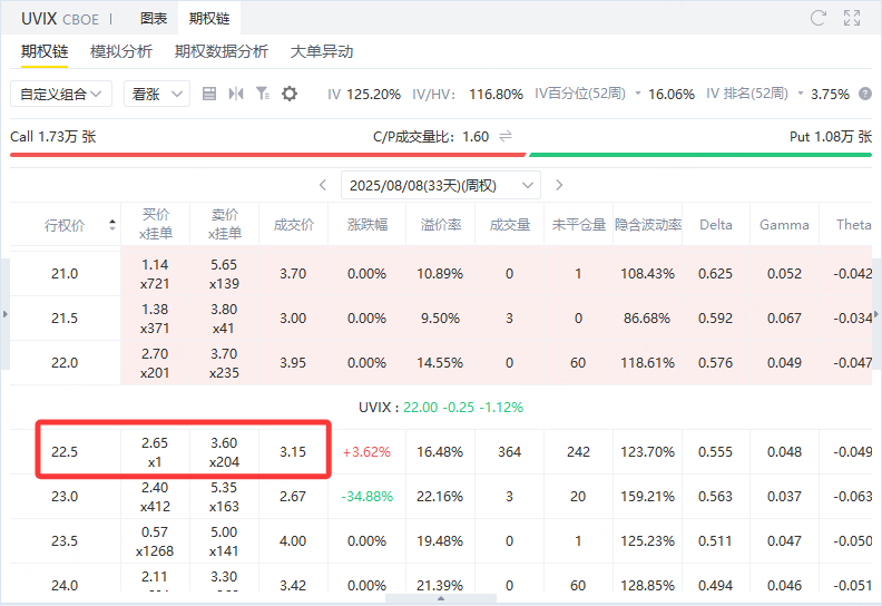 设定投入1%到1.5%的资金作为对冲头寸,对应金额约为1万美元到1.5万美元。投资者可以选择买入40张UVIX 22.5的看涨期权,每张成本315美元,总投入大约为12,600美元。