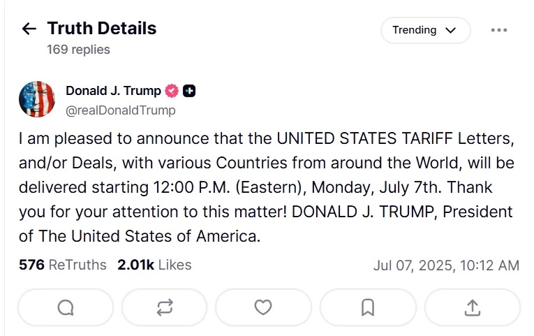 美国总统特朗普在社交媒体发文:“我很高兴地宣布,美国与世界各国的关税信函和/协议,将于美国东部时间7月7日中午12点(北京时间周二凌晨)开始发出。”