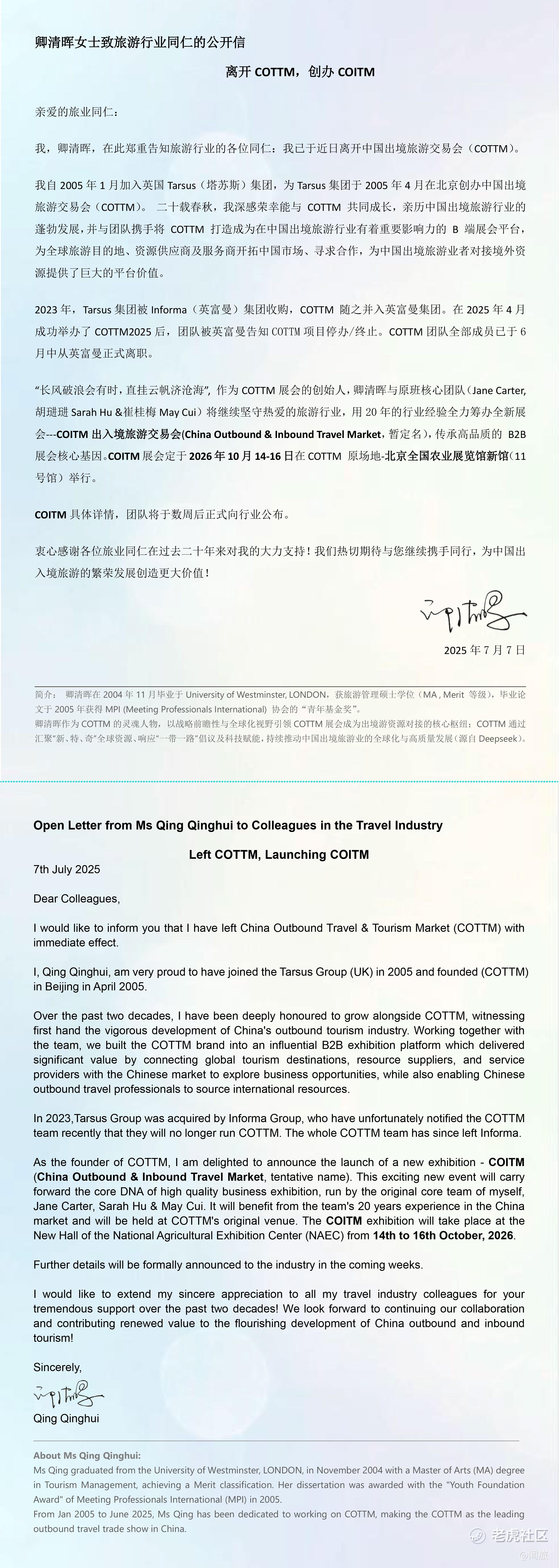 7月7日上午,原中国出境旅游交易会(COTTM)项目总监卿清晖女士发布公开信,正式官宣自己已于近日离开COTTM,并将带领原班核心团队,用20年行业经验全力筹办全新展会——COITM出入境旅游交易会。