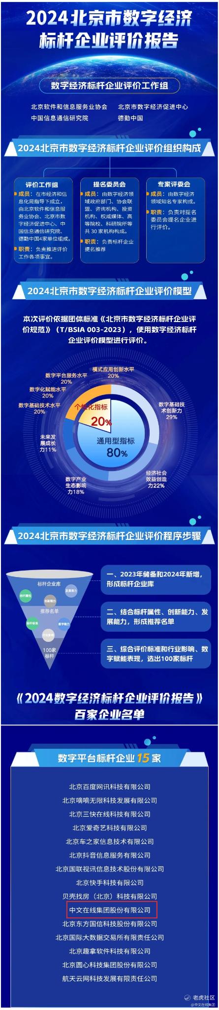 该奖项由北京软件和信息服务业协会、北京市数字经济促进中心、中国信息通信研究院和德勤中国联合组成的评价工作组严格评选,依据《北京市数字经济标杆企业评价规范》团体标准,采用“通用指标+个性化指标”模型,从企业储备库中遴选出100家标杆企业。包括数字基础技术类、数字化赋能类、数字平台类、新模式新应用类,覆盖基础软件、人工智能、智能制造等 41 个细分领域。中文在线入选数字平台类标杆企业”。