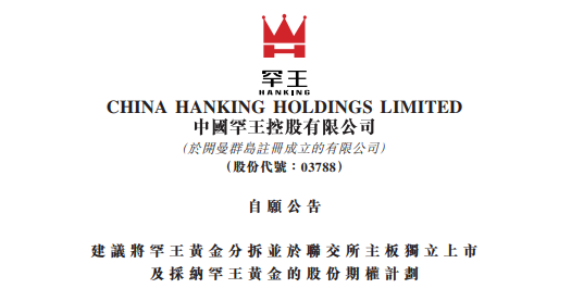 中国罕王(03788.HK)公布,建议透过介绍上市方式将罕王黄金股份分拆,并于联交所主板独立上市。
