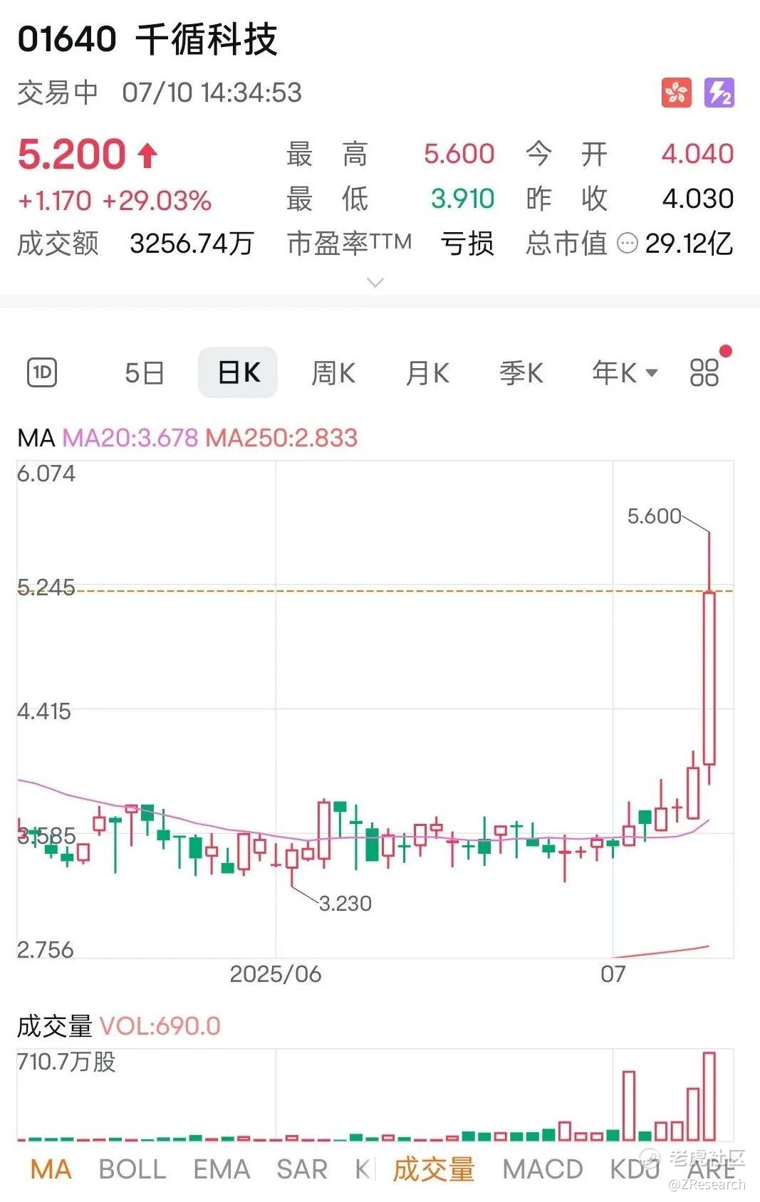 千循科技(01640-HK)曾升近30%,今日最高价见5.60元,创新高,现升28.54%,报5.18元;今日成交626.4万股,成交金额2931万元;现时最大净被动买入券商为国泰君安证券共69万股;现时最大净被动卖出券商为富途证券共49.4万股。以现价计,该股暂连升2日,累计升幅41.03%。