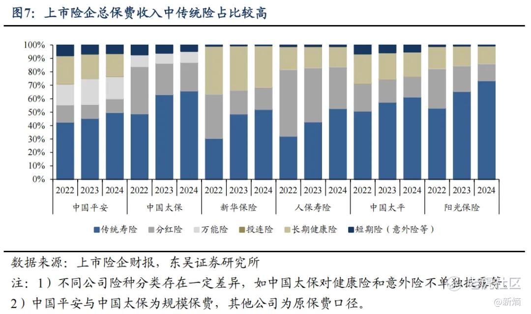 据东吴证券分析,2023 年以来,以增额终身寿为代表的传统型储蓄险始终是寿险市场主力产品,2024年上市险企总保费中,传统险占比已经达到59.2%,同比提升5.4个百分点。从上市险企保费收入前五大产品形态可以看出,传统型增额终身寿险占据多席。