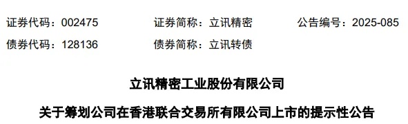 A股上市公司、“果链”三巨头之一的立讯精密(002475.SZ)在深交所公布,为深化其全球化战略布局,增强境外融资能力,进一步提升公司治理透明度和规范化水平,公司目前正在筹划境外发行股份(H股)并在港交所上市事项。