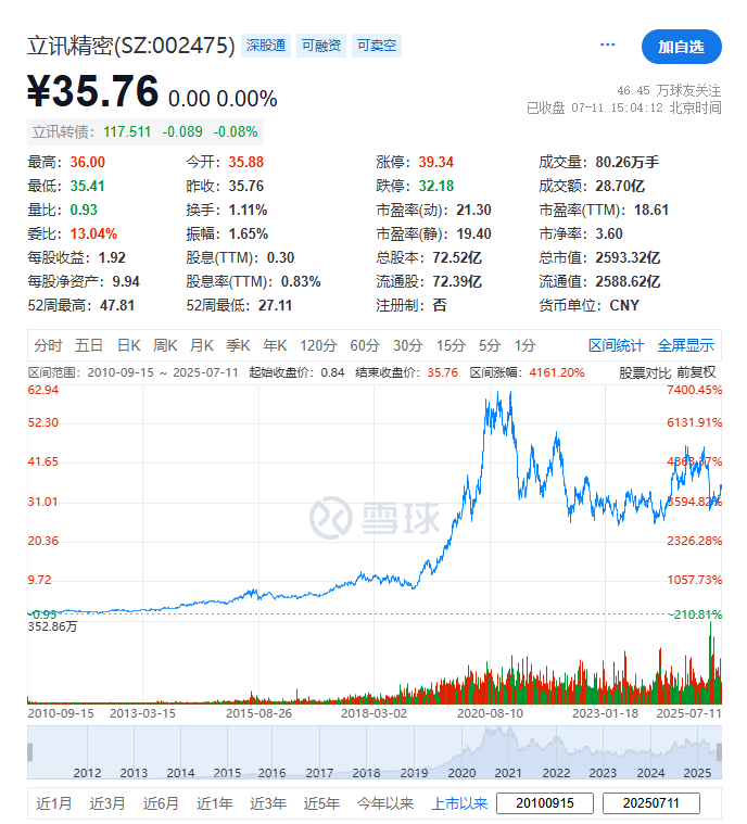立讯精密(002475.SZ),于2010年在A股上市,截至2025年7月11日收市,其每股收报人民币35.76元,目前总市值约人民币 2593.32亿元。