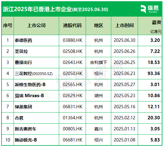 2025年上半年在港交所上市的浙江企业共10家,IPO募资约177亿港元,分别占同期香港新上市总数量的22.7%、IPO募资总额的16.5%;