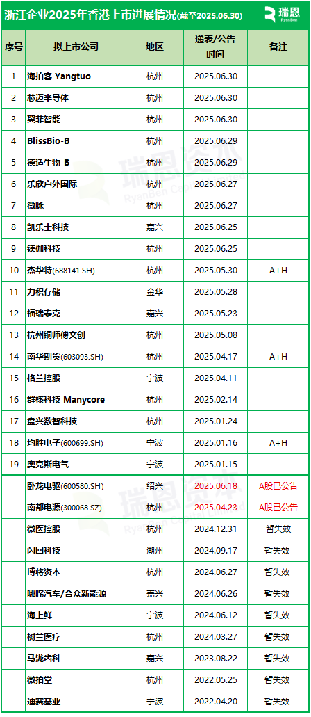 2025年上半年在港交所递表的浙江企业共19家,占所有递交企业总数(240家)的7.9%。