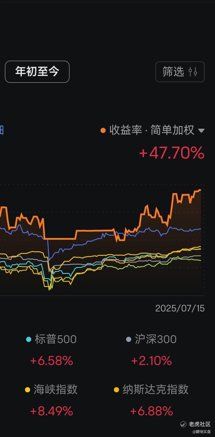 2025-07-15【实盘账户净值2025年第18次新高】二连涨!是个好兆头!先看看能不能持续下去吧!基本面上消费数据利好,且流动性释放在即,双利好加持下大概率还要继续涨吧?!天气炎热就不多说了[尴尬][汗][擦汗]【“事以密成言以泄败”+“黑暗森林法则”+“量子坍缩效应”决定了若是要赚亲自下场“淘金”的钱则需要闷声才能发财,而若是想赚“卖铲子”的钱才需要大声吆喝博流量。淘金与卖铲子,二者无关高下,只是目前的盈利模式属于亲自下场“淘金”,而非“卖铲子”!不“卖铲子”无需每日更新。更新原则:实盘账户净值创历史新高发净值曲线截图,建仓后上涨超过预期涨幅的61.8%发账户持仓K线截图】【活得久赚的久比赚得多更重要!时刻牢记必要时止损!止损就像“核按钮”平时几乎用不到但关键时刻必须要有。止损后虽然账面会亏一些但此时依然活着,活着就有机会再创新高!不止损类似闯红灯:可能大部分情况都能涨回来,但总会有1次被彻底消灭甚至还要负债彻底翻不了身!】【说明】做真实而又公开的实盘记录。真实,要求信息全部披露,最好代码也一并公开一览无余;公开,投资领域由于监管以及心理等各种因素所限,注定了不可能完全公开,很多东西根本就不适合在公开场合来讲。经深思熟虑,真实的,且适合在公开场合来讲的,只有账户净值从小做到大的“逻辑连贯性”,具体体现在净值曲线变动跟持仓K线走势的尽可能的连续展示。代码,尤其是单一持仓的实盘代码,是暂不适合公开展示的。实盘每次只做一只,这只要经过十几轮各种条件的严格筛选。一旦买入持有1-3个月。公开记录实盘资金曲线。不保证每天记录但绝对保证如实记录!净值创新高必更新!若隔夜实盘净值创新高则发文开头会标注【实盘账户净值202x年第N次新高】。