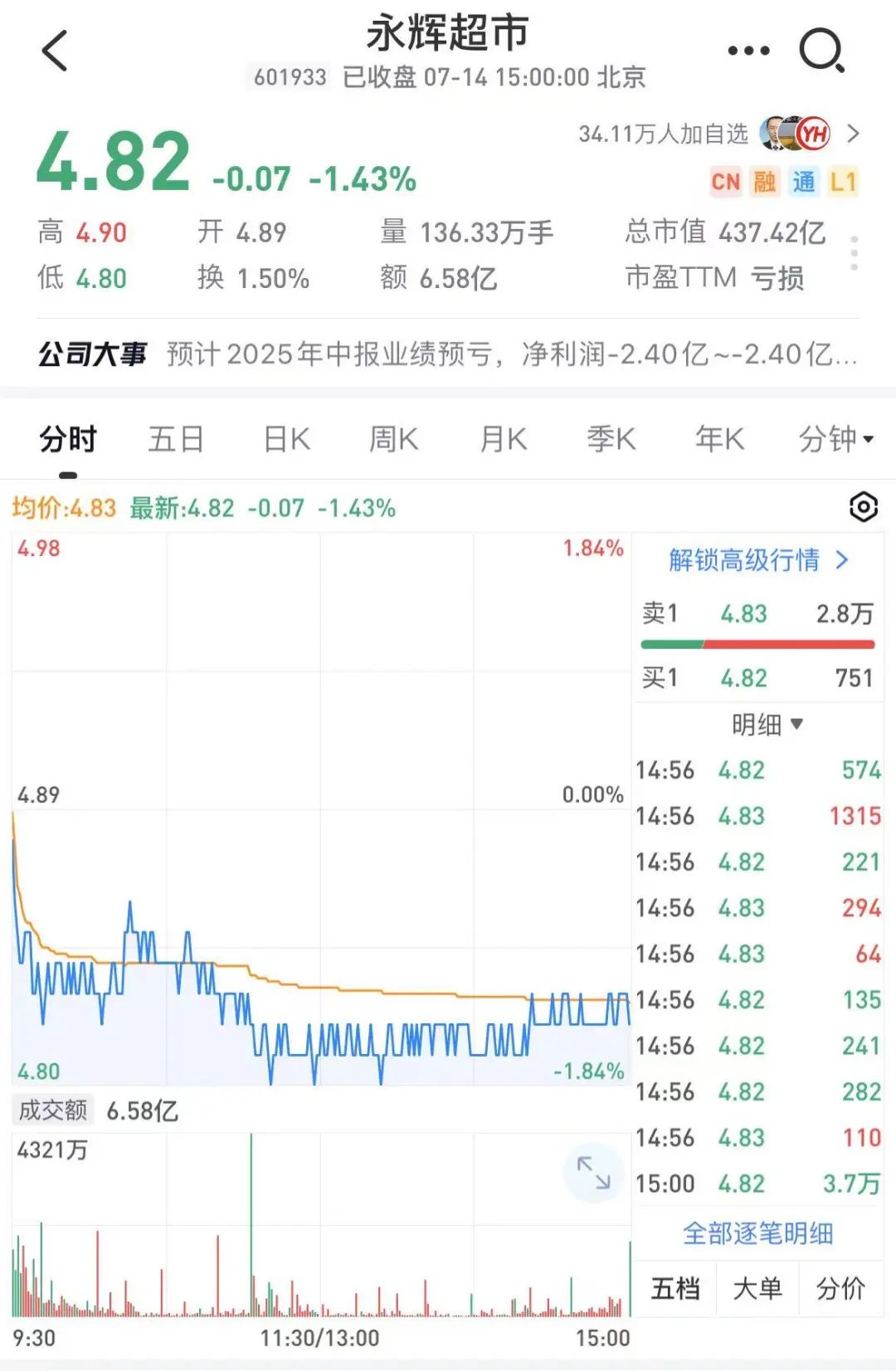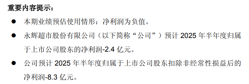 1、7月14日盘后,永辉超市披露了业绩预告,巨亏。根据这份预告,经财务部门初步测算,永辉超市预计2025年半年度实现归属于上市公司股东的净利润-2.4 亿元,与上年同期相比,将出现亏损。此外,公司预计 2025 年半年度实现归属于上市公司股东扣除非经常性损益后的净利润-8.3 亿元。