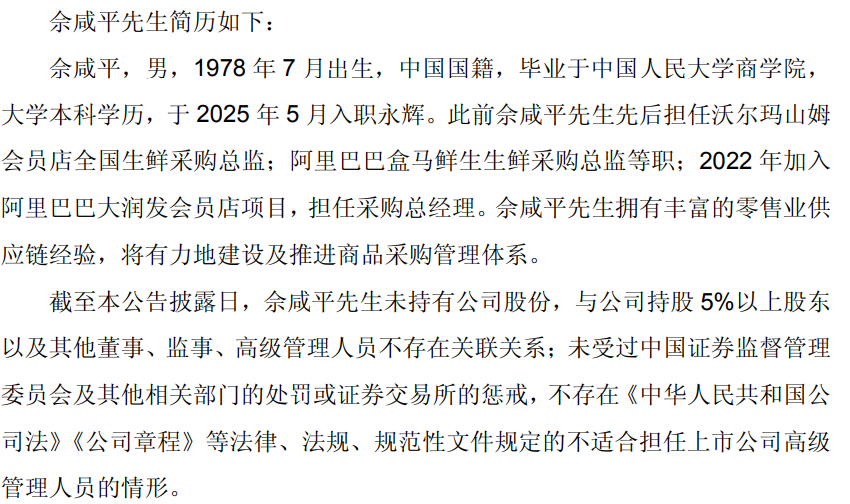 佘咸平,1978年7月出生,于2025年5月入职永辉。此前佘咸平先后担任沃尔玛山姆会员店全国生鲜采购总监;阿里巴巴盒马鲜生生鲜采购总监等职;2022 年加入阿里巴巴大润发会员店项目,担任采购总经理。