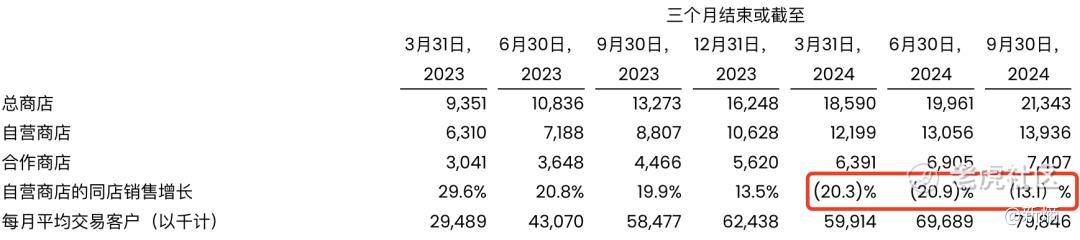 根据瑞幸2024年的数据,瑞幸2024年全年的自营门店同店销售额同比下滑16.7%,而上一财年的增长为21%。