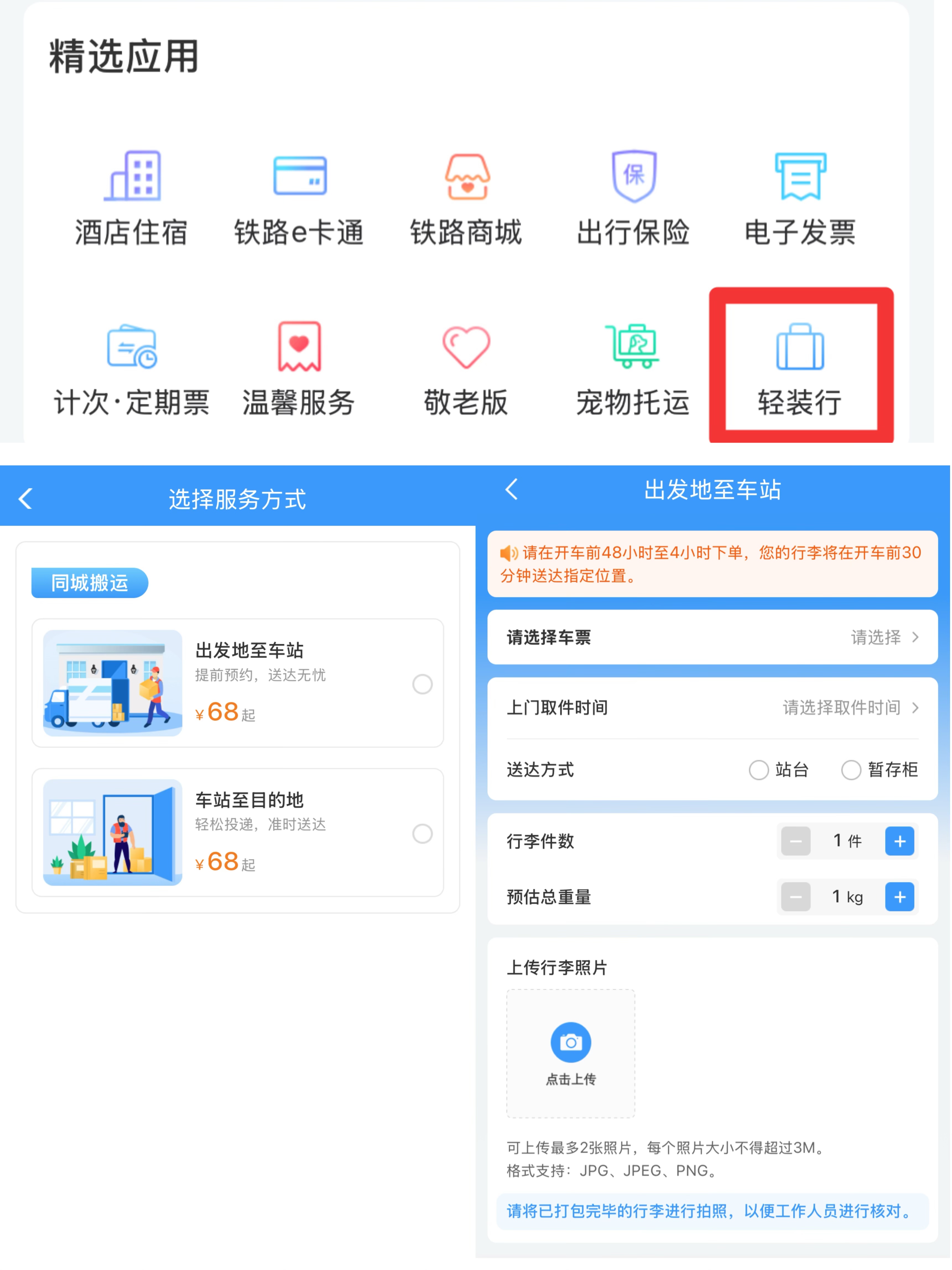 据了解,该项服务覆盖车站周边35公里范围,旅客可根据实际需要灵活选择“门到站”和“站到门”两种模式。具体流程上,旅客购买车票后可通过铁路12306App、微信小程序预约“轻装行”服务,填写办理人信息、车次和行李详情,线上支付费用。“轻装行”服务试点初期按件计费,价格为“出发地至车站”和“车站至目的地”68元/件,“出发地至所乘列车站台”和“所乘列车站台至目的地”98元/件,后期将根据市场需求、运营成本等因素动态调整。