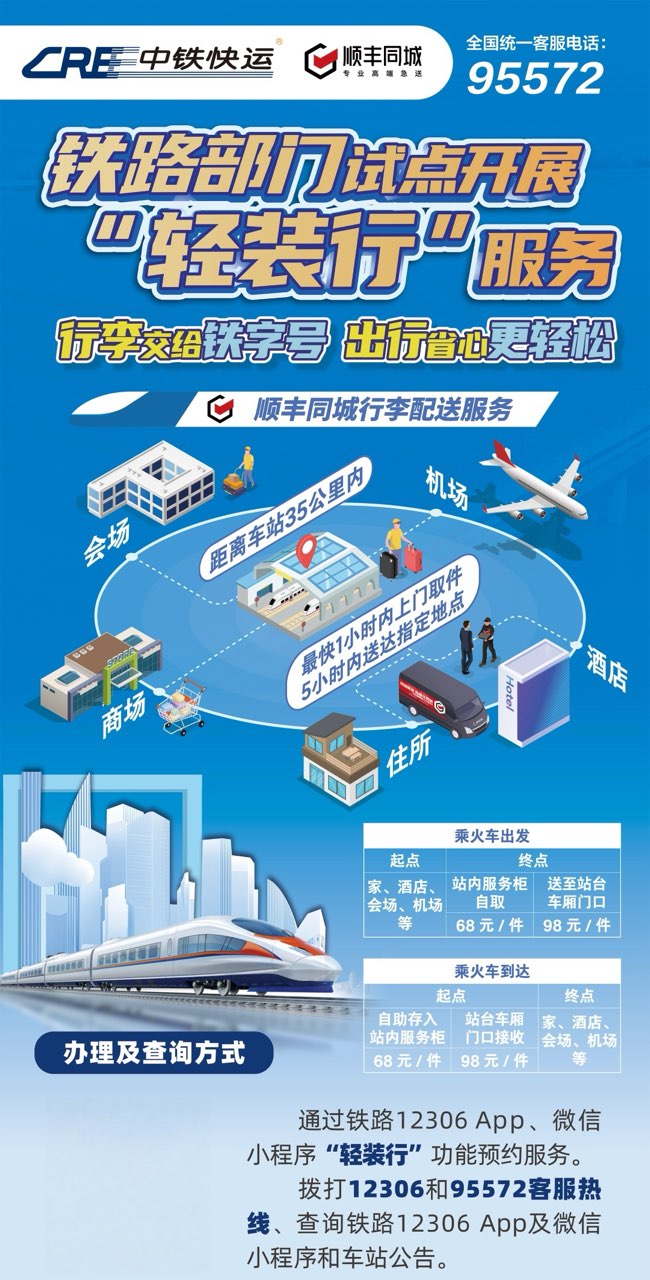 近日,顺丰同城与中铁快运达成合作,在北京西、上海虹桥、广州南等19座车站试点推出“轻装行”服务,为旅客提供“门到站”“站到门”同城行李搬运服务,铁路12306App、微信小程序同步推出“轻装行”功能,旅客可通过线上预约办理,由顺丰同城提供行李配送服务支持,将有效减轻携带大件行李出行的负担,乘坐火车出行更加方便快捷。
