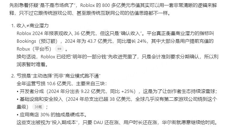 Roblox的高市值并非基于短期利润,而是基于其平台级生态的高成长性、极强的用户与开发者粘性、内容飞轮效应,以及未来多元商业化空间。就像早年的YouTube、Facebook、Netflix一样,市场愿意为其“占据未来数字娱乐和社交流量入口”的潜力买单。当前亏损只是高投入扩张期的暂时现象,长期来看更看重其“青少年数字世界的基础设施”地位和持续高增长预期。