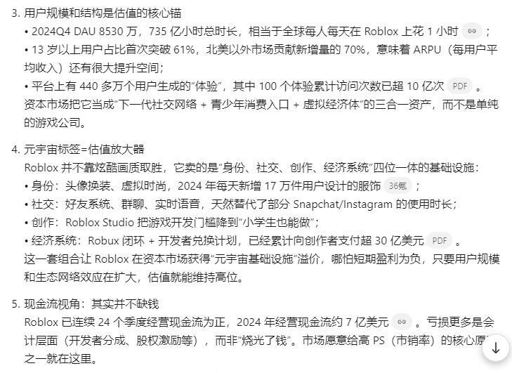 高估值反映平台“稀缺性”与长期潜力:当前PS(市销率)接近18倍,P/FCF更高,已显著高于传统游戏公司,但市场将其视为“元宇宙入口”和全球青少年流量平台,赋予更高溢价3。
