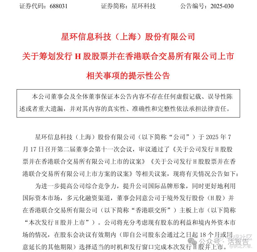7月17日,来自上海的企业级大数据基础软件开发商星环科技(688031.SH)发布公告称,为进一步提高公司综合竞争力,提升公司国际品牌形象,同时更好地利用国际资本市场,多元化融资渠道,董事会同意公司拟发行H股股票并在港交所主板上市。
