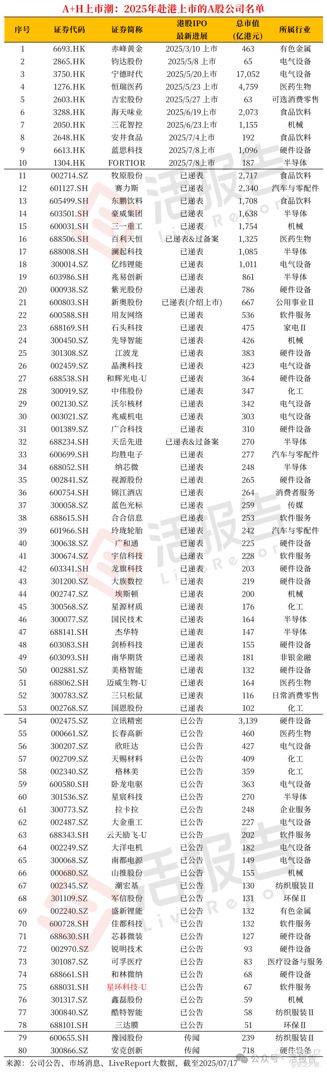 据LiveReport大数据统计,截至7月17日,今年已有赤峰黄金(6693.HK)、钧达股份(2865.HK)、宁德时代(3750.HK)、恒瑞医药(1276.HK)、吉宏股份(2603.HK)、海天味业(3288.HK)、三花智控(2050.HK)、安井食品(2648.HK)、蓝思科技(6613.HK)及FORTIOR(1304.HK)登陆港交所,实现AH上市;此外,还有70家公司拟“A+H”上市,其中43家已递表,25家已发公告,2家传闻上市,AH上市浪潮势不可挡。