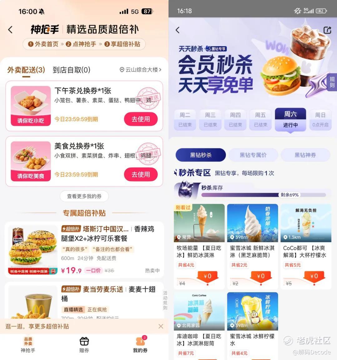 还有多个抢券入口,比较大力度的补贴是一个“各得16元外卖券”活动,提示用户分享给好友后最高可得16元,也相当于是“0元购”了。