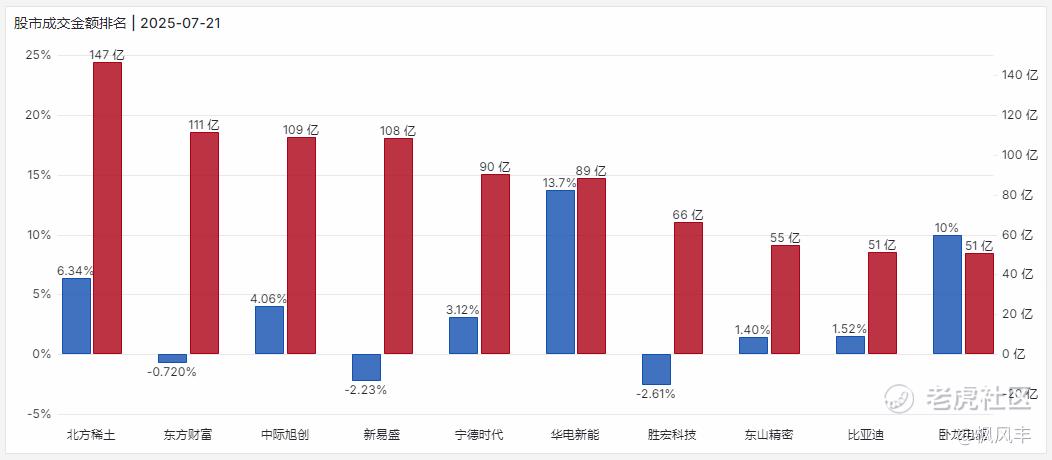 1、成交额前三:$北方稀土(600111)$、$东方财富(300059)$、$中际旭创(300308)$