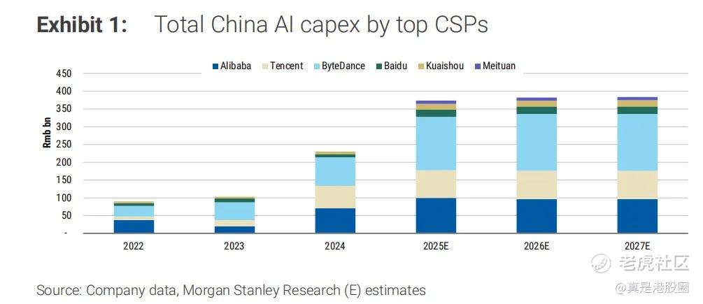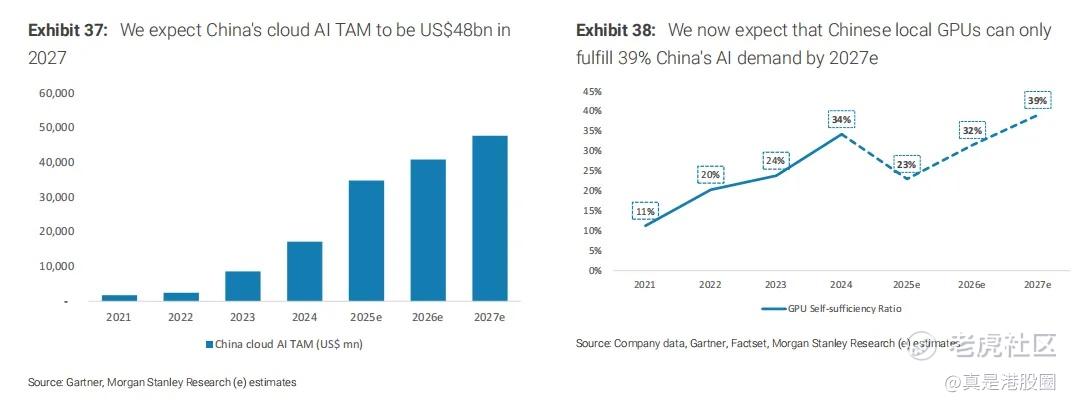 2.大摩预计,中国云AI市场在2027年将达到480亿美元,预计到2027年,中国本地的GPU将仅满足中国AI需求的39%。换句话说,大摩认为未来两三年互联网股的Capex还会不断增加。