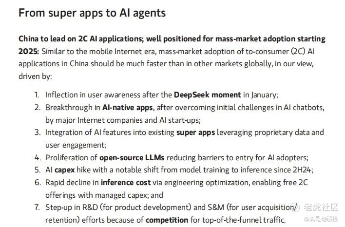 原因是大摩认为,跟互联网时代类似,面向消费者的AI应用在中国普及速率将显著快于全球其他市场,主要受到这些因素的驱动: