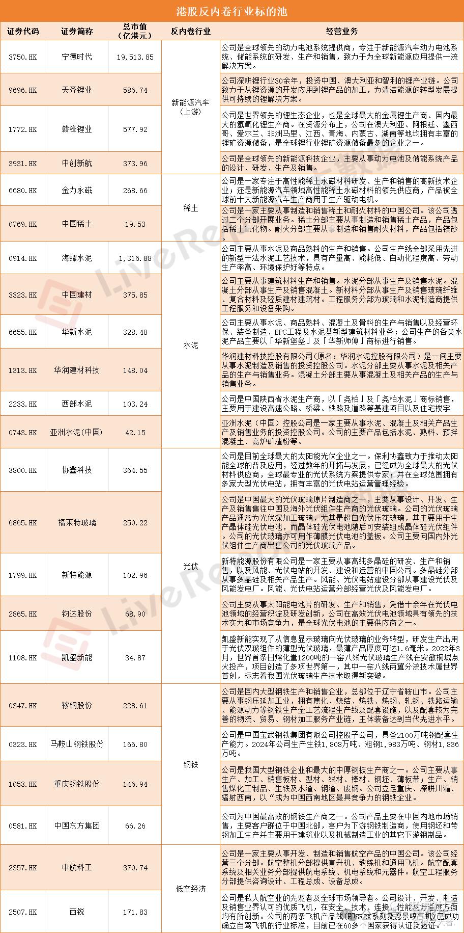 根据LiveReport大数据,就以上反内卷行业,从港股市场精选出23家相对应的标的公司,具体公司如下图所示: