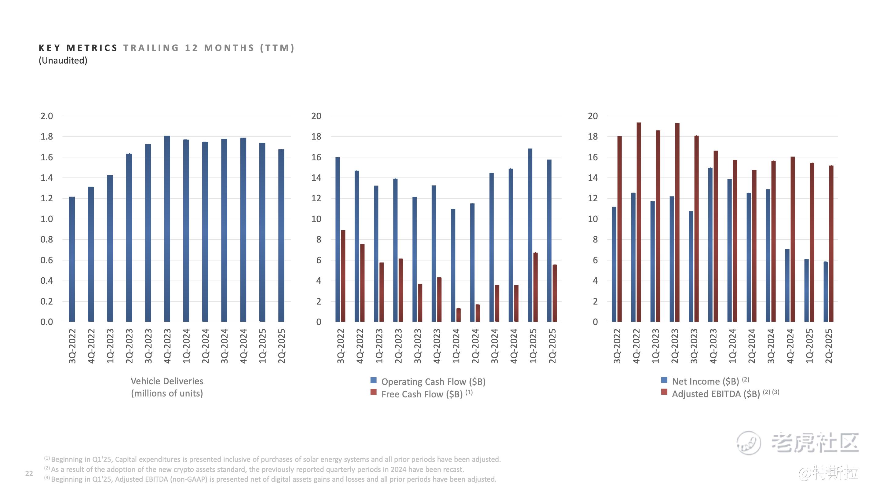 🤖2025年第二季度是特斯拉历史上的一个关键转折点:我们在保持电动车与可再生能源领导地位的同时,开始引领人工智能、机器人及相关业务的发展。特斯拉Robotaxi无人驾驶出租车服务于6月在奥斯汀推出,虽然服务初期规模有限,但我们相信,特斯拉的自动驾驶技术路线(基于视觉架构,结合全球数百万辆车数据训练的神经网络),使我们能够持续提升安全性,快速扩展规模并提高盈利能力。